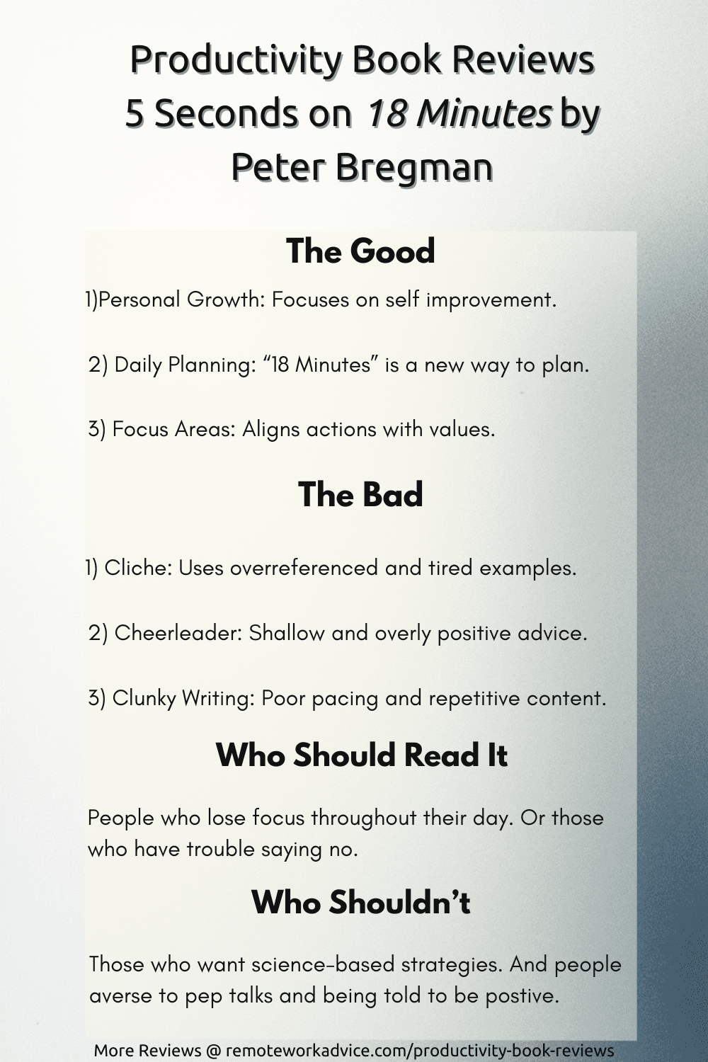 18 minutes champions personal growth and how to structure your goals and daily tasks to achieve more. Conversely, it does so in a cliché-ridden, repetitive, and nonspecific way.