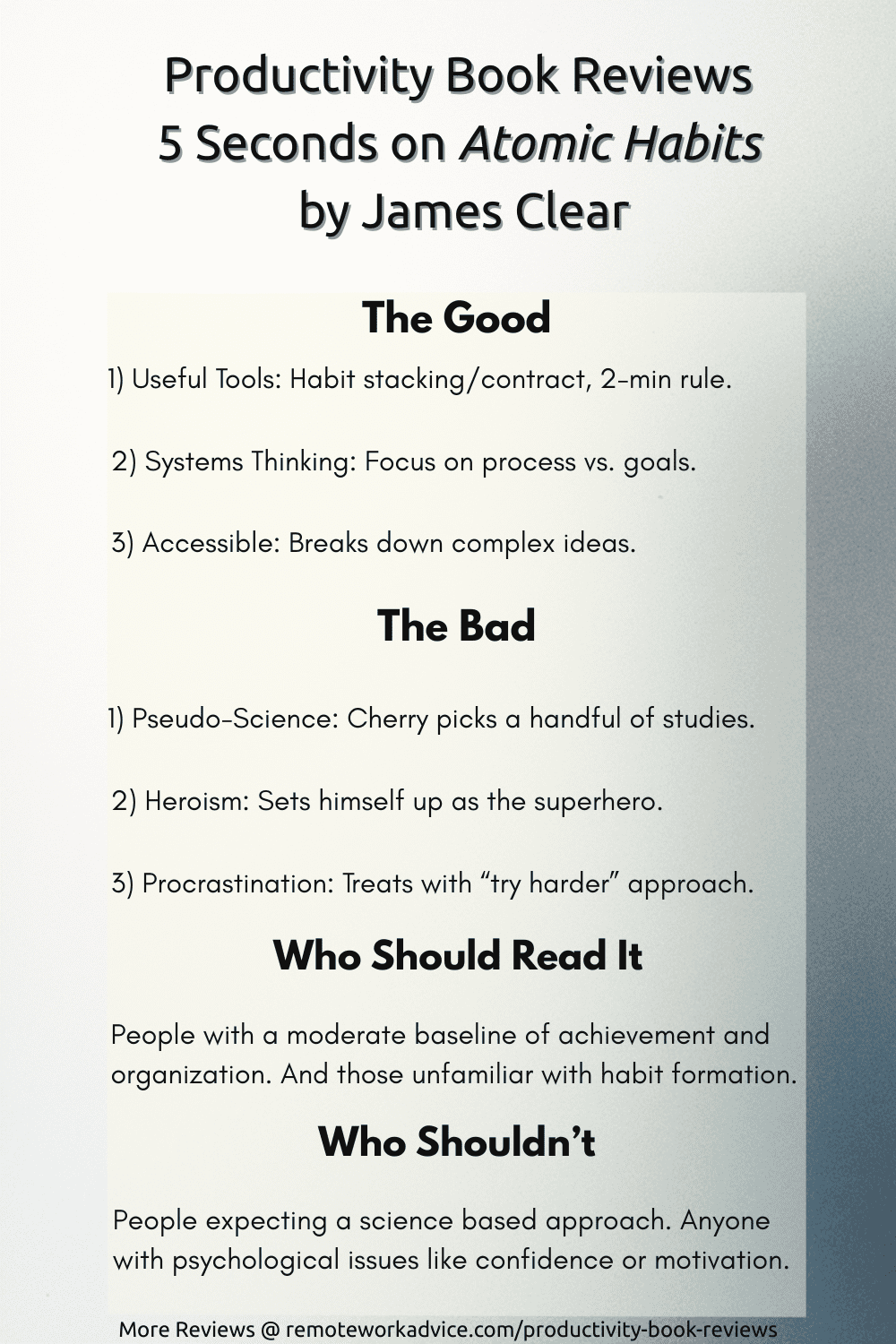 Casual writing has appeal, but Atomic Habits has some serious issues. First, the book includes excessive analogies and anecdotes. Often, their purpose seems to be an opportunity for Clear to brag.