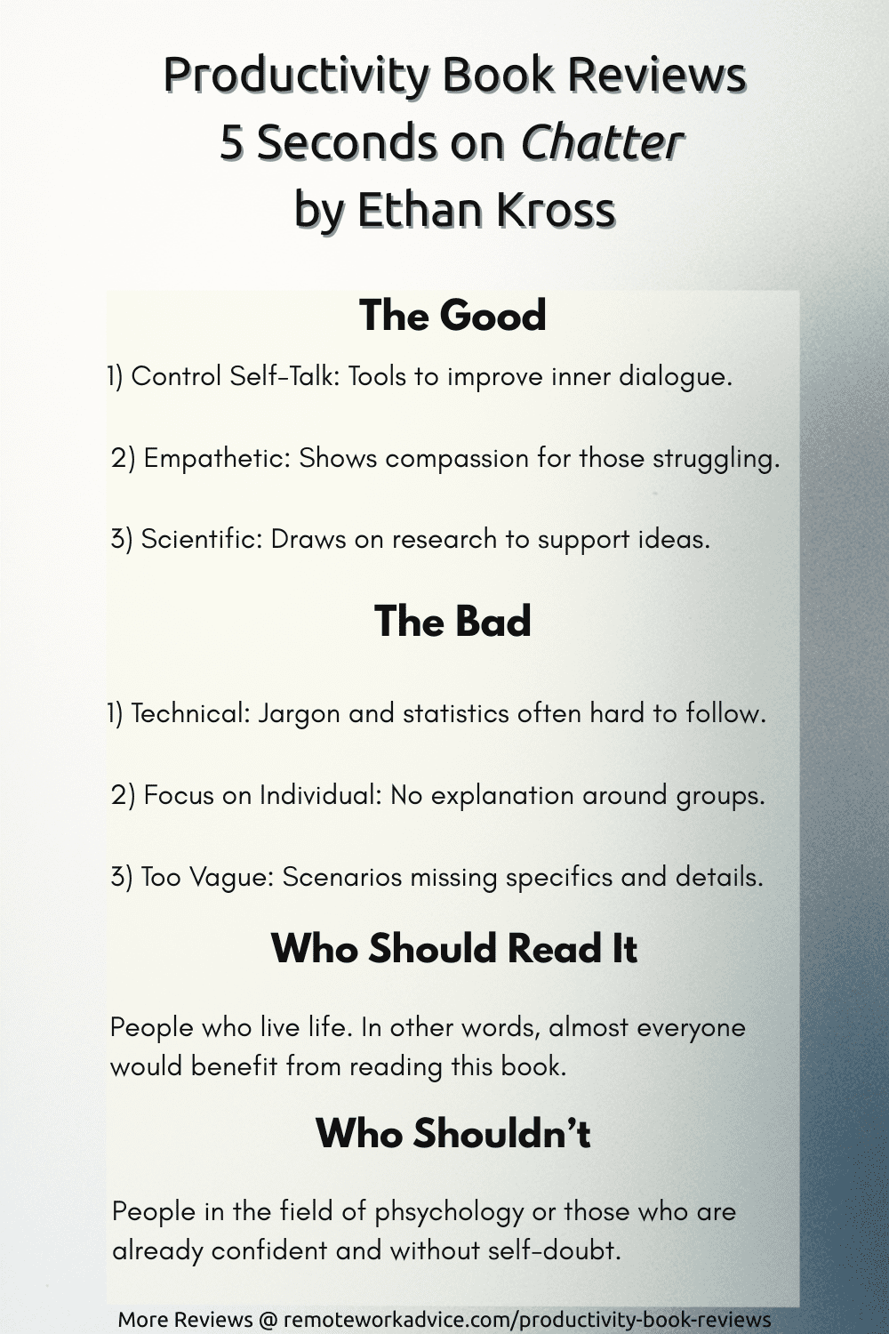 Summary of Ethan Kross's Chatter showing pros, cons, and reader fit. Divided into four sections: The Good, The Bad, Who Should Read, and Who Shouldn’t.
