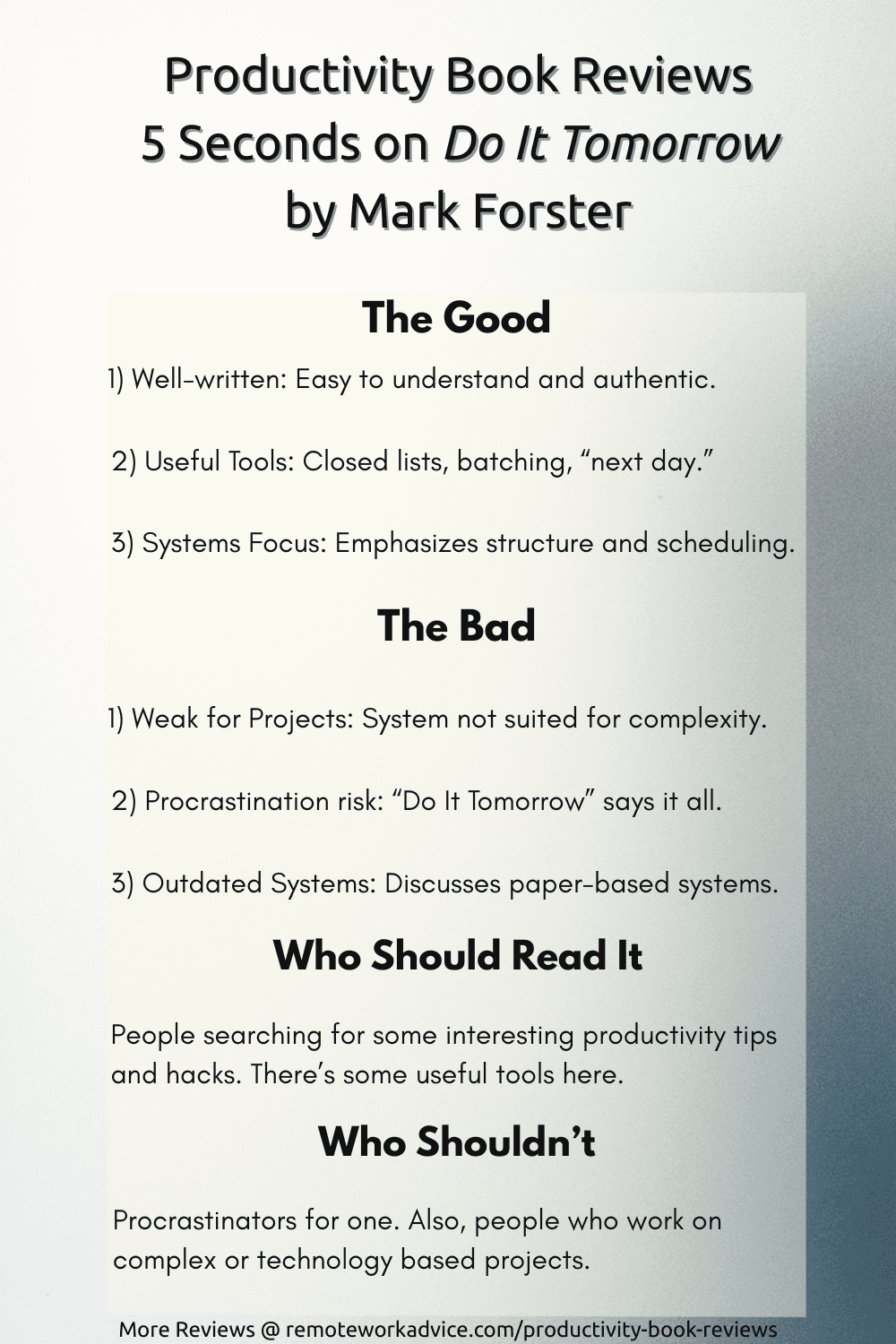 Do It Tomorrow presents several ideas that can help you be more efficient. However, as a standalone productivity system, it fails. Don’t buy the menu, only the chef’s specials.