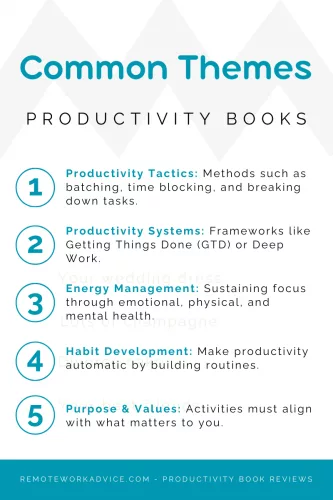 Top productivity books share techniques to improve both. These include time blocking, the Pomodoro Technique, and batching, among others.