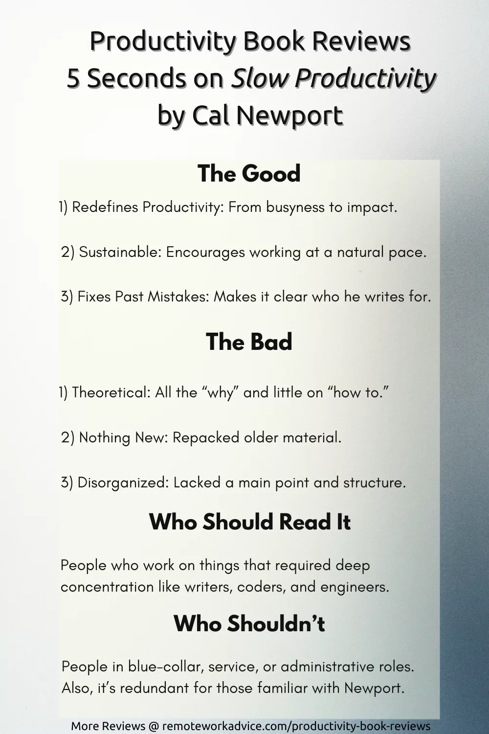 Blue-collar, service, and administrative jobs should avoid this book. Those familiar with Newport’s work will find reading this book redundant. Moreover, people who want tactical productivity tips and tricks shouldn’t read it either.